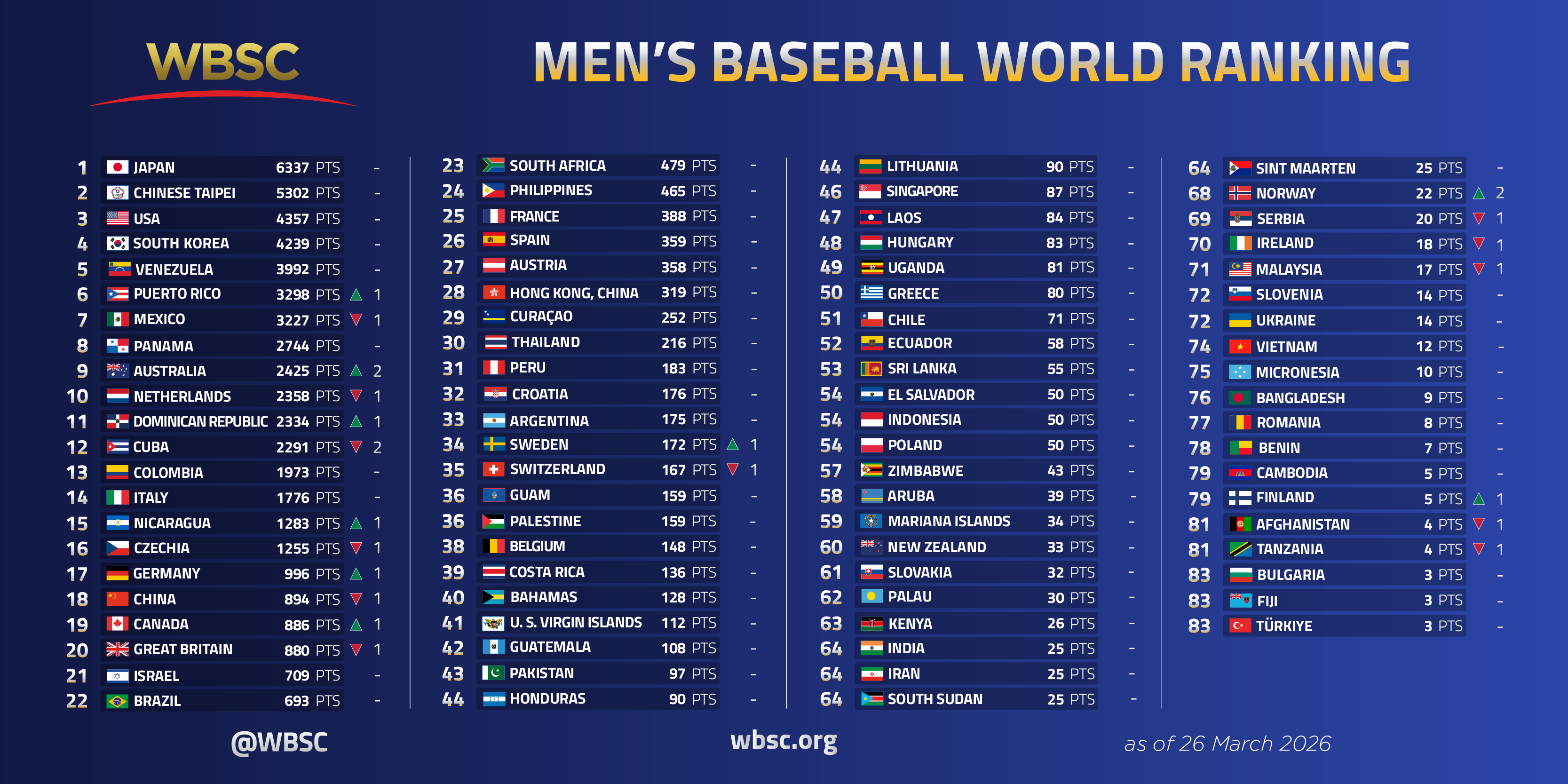 The WBSC Men's Baseball World Ranking includes all results from the past four years across WBSC sanctioned tournaments from the WBSC U-12 Baseball World Cup to […]